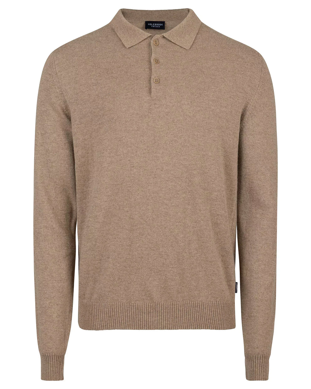 Knitted wool and cashmere collar sweater. Three colour matching buttons. Rib knitted details at endings. The yarn is certified by GRS.
